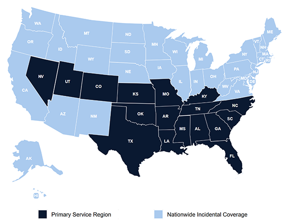 Primary Service Region with nationwide incidental coverage available for contractors and trades.